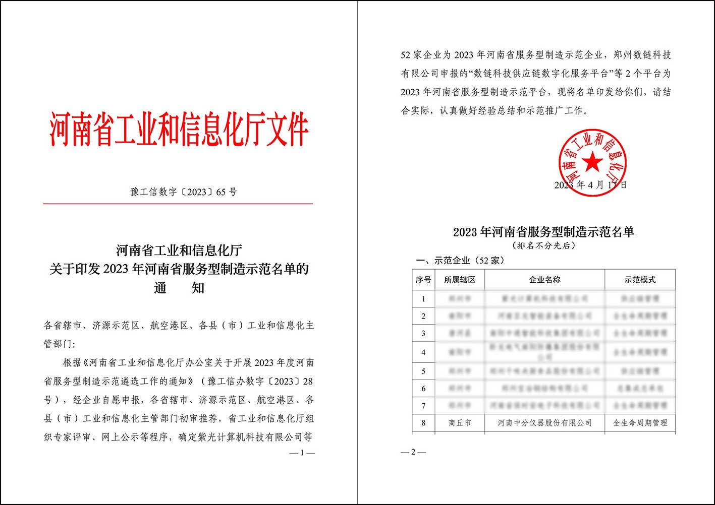 近日,河南省工業(yè)與信息化廳公布了《河南省工業(yè)與信息化廳關(guān)于印發(fā)2023年河南省服務(wù)型制造示范名單的通知》,我公司被評(píng)為河南省服務(wù)型制造示范企業(yè),這是對(duì)我公司服務(wù)理念和綜合實(shí)力的認(rèn)可。